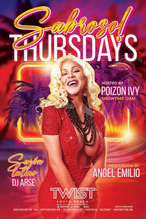 "Miami's Hottest Latin Night" hosted by Poizon Ivy every Thursday night in the Main Room (12AM Showtime)! LIVE Percussion by Angel Emilio & Sabroso Latin Beats by DJ ARSE till 5AM!